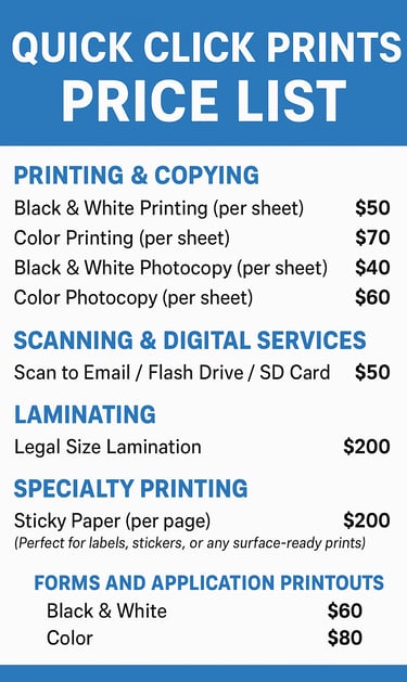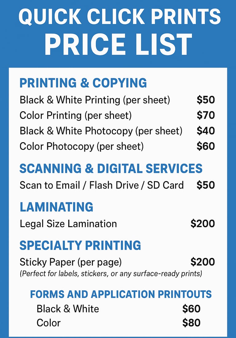 At QuickClick Prints, we believe in keeping things simple, affordable, and professional. Below you’ll find our clear pricing for printing, copying, laminating, scanning, and more. No hidden fees—just fast, reliable service every time.